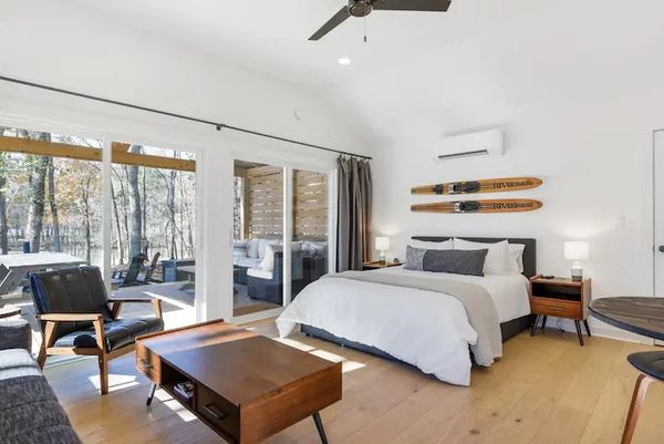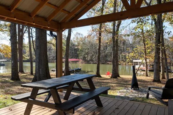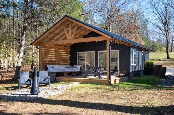 A cozy getaway with a breathtaking lakeside view on a quiet cove on Old Hickory Lake, just 40 minutes from Nashville. This mid-century modern tiny home with a rustic flare features a kitchen, bath, bed and living room with accommodations for up to 4 and all the necessities of home. Enjoy the covered porch, stone patio